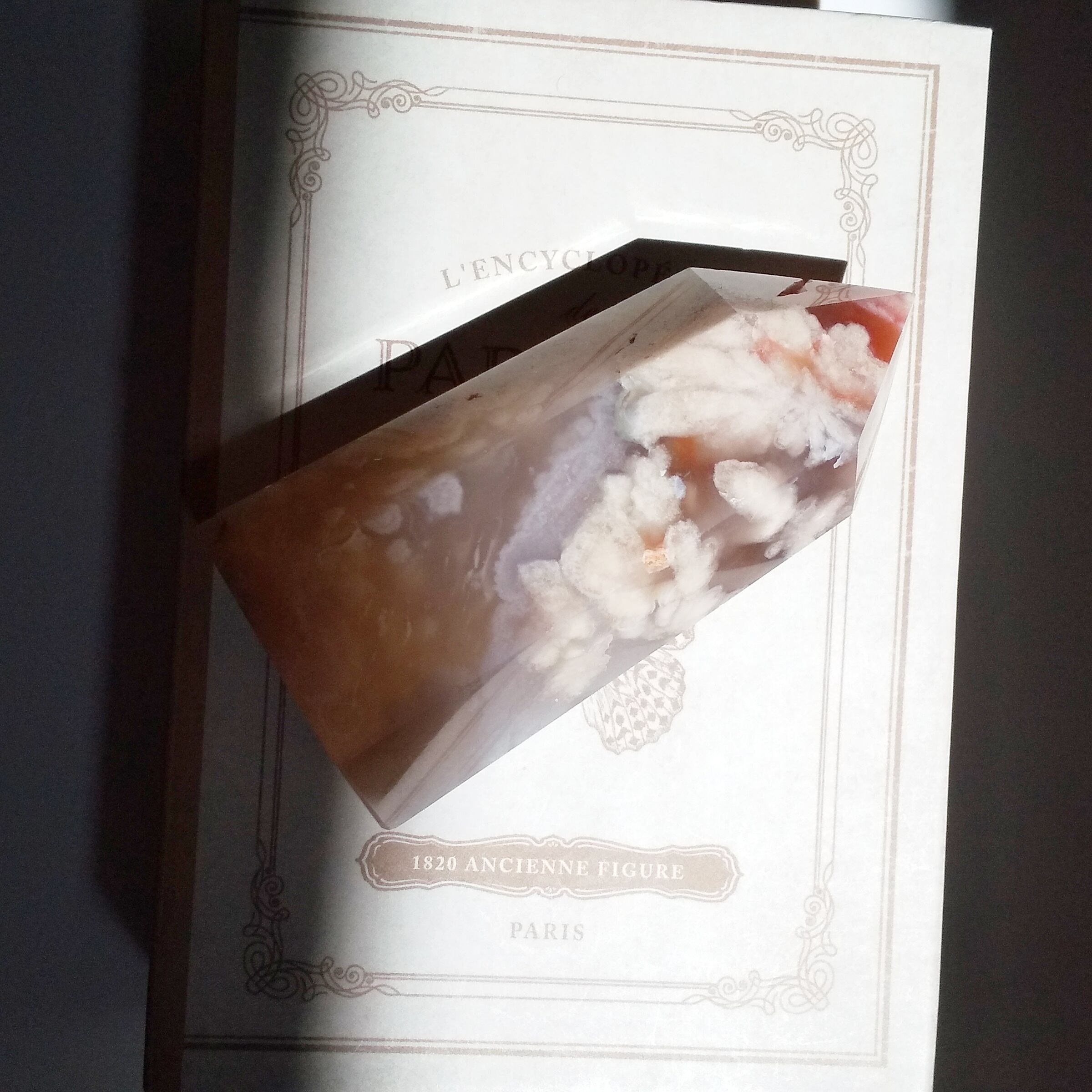ベージュのベースに可憐な薄桜色の大きなお花が咲いたフラワーアゲートのタワーが入荷しました。先端のピンクがチャームポイントです。
