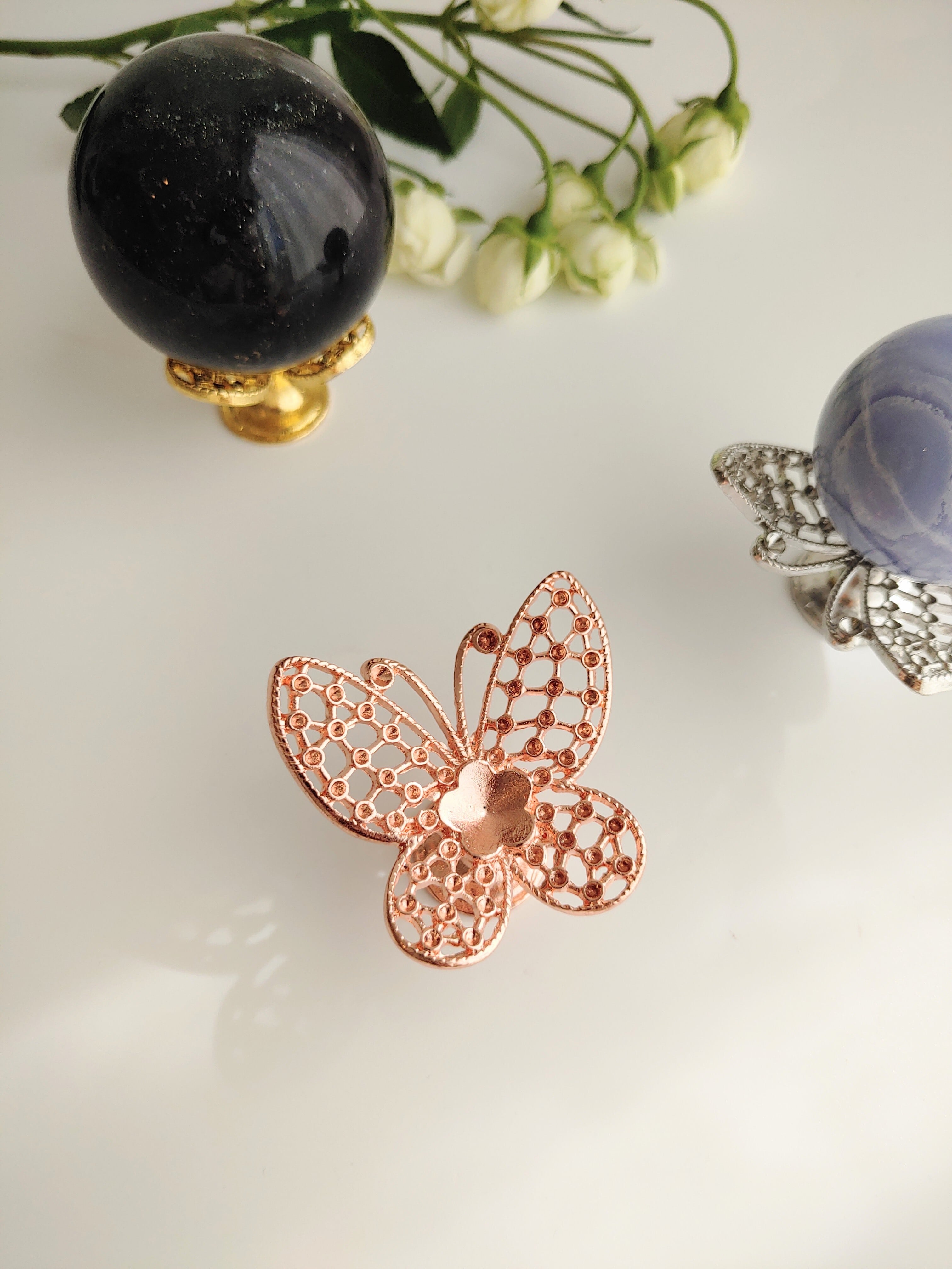 可愛らしい蝶々のスフィアスタンドです。スフィアをのせるとお花のようにも見えます。小さめスフィア(2~3.5cm)ぐらいにオススメです。5㎝のスフィアにもお使いいただけますが、やや不安定です。ゴールド、ピンクゴールド、シルバーの3色です。