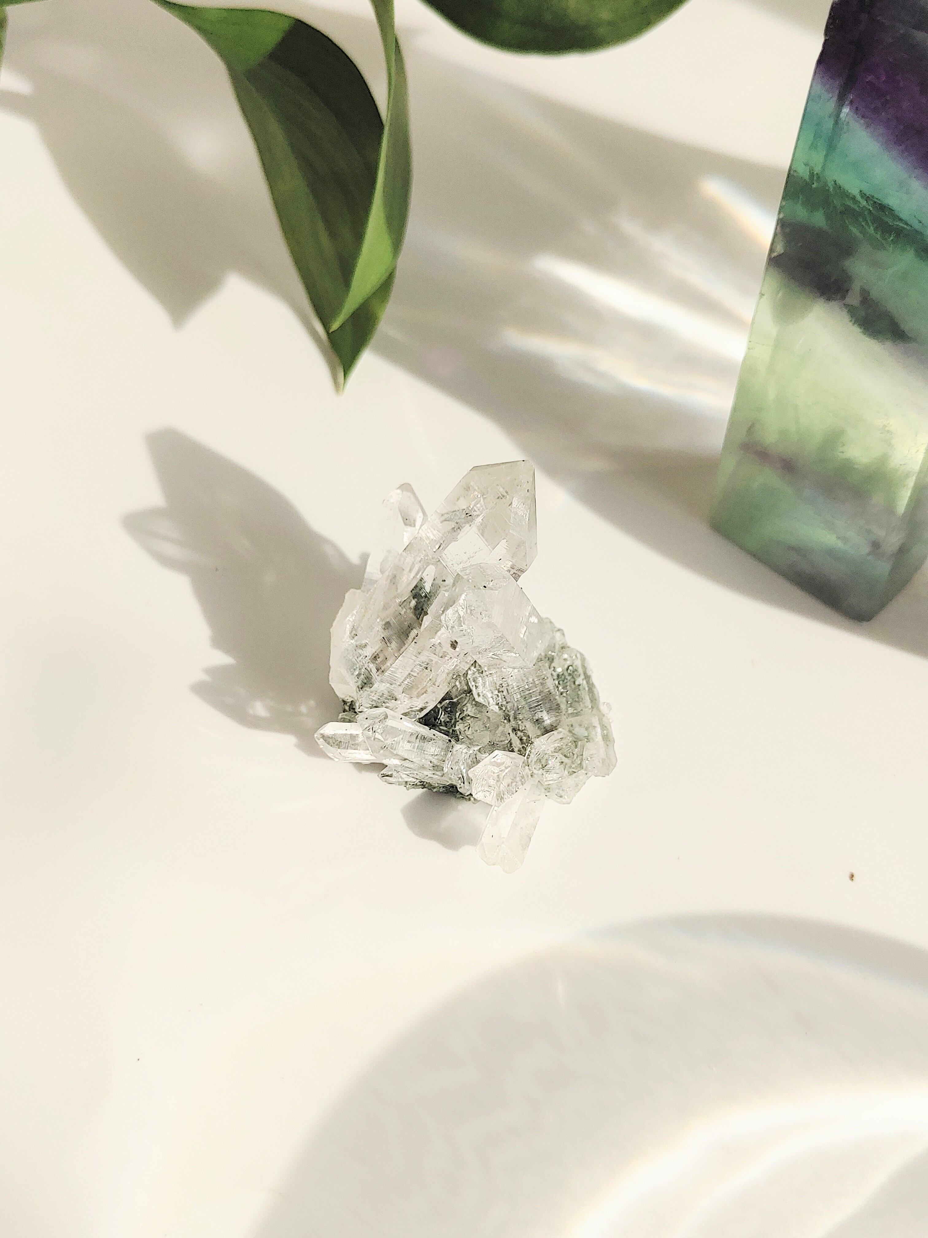とても美しくパワーのある水晶クラスターです。 底面に、緑泥石(クローライト) が共生しており、ほんのり水晶がグリーンに見えて美しいです。
