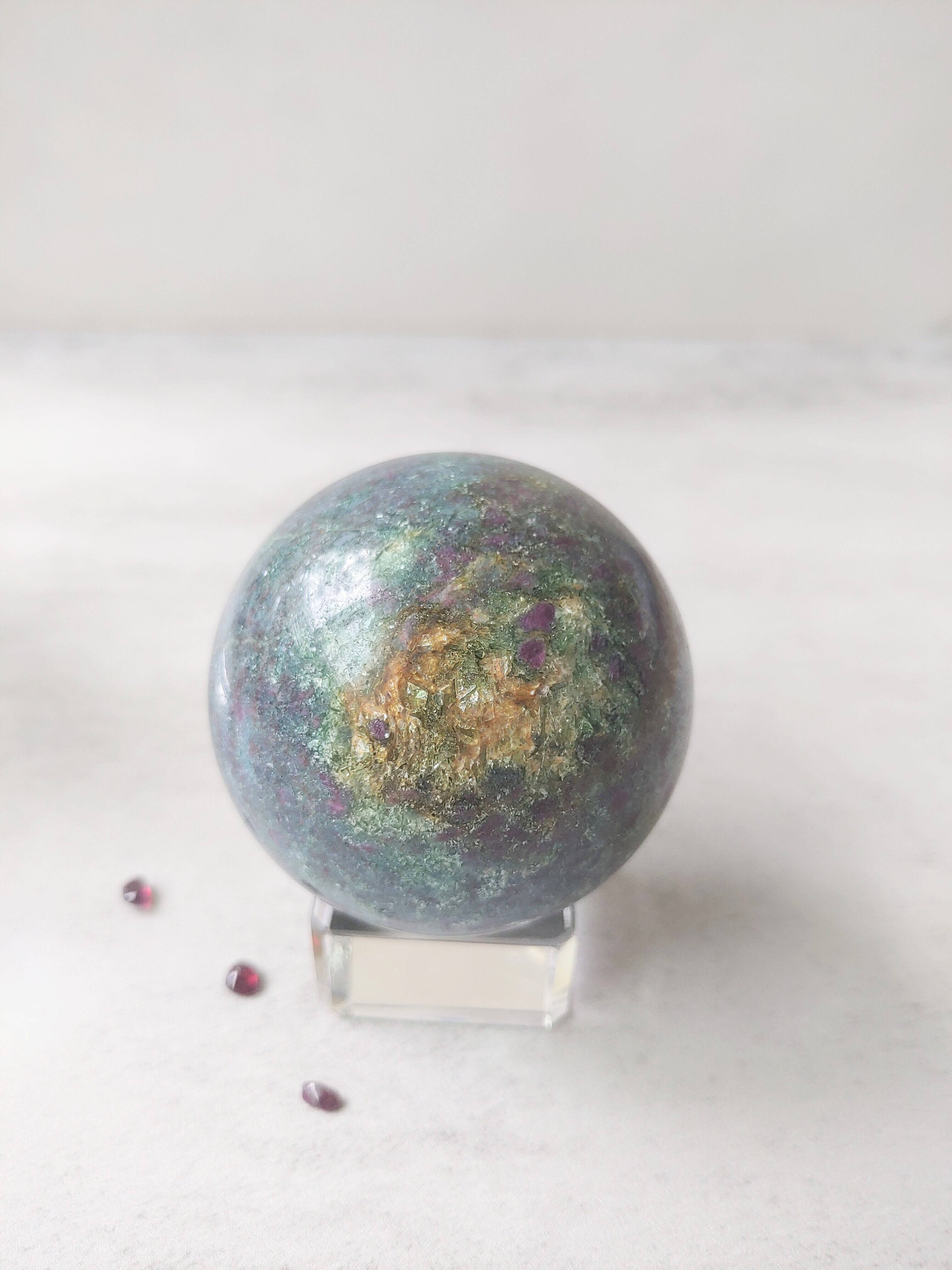 ブルーグリーンのカイヤナイトとワインレッドのルビーが混じり合い、絵画のような模様になっています。